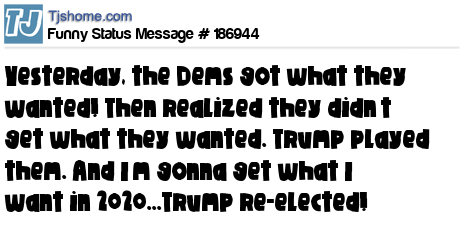 X says Yesterday, the Dems got what they wanted! Then realized they didn’t get what they wanted. Trump played them. And I’m gonna get what I want in 2020...Trump re-elected!
