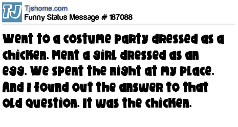 X is Went to a costume party dressed as a chicken. Ment a girl dressed as an egg. We spent the night at my place. And I found out the answer to that old question. It was the chicken.