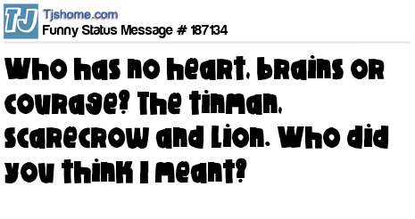 - # 143402 If the lion wasn't a coward and the Scarecrow had a brain, they would have warned the Tinman that he was better off without a heart.