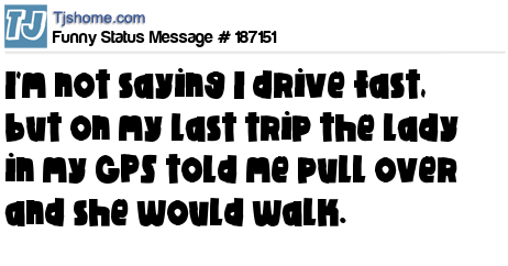 X says I'm not saying I drive fast, but on my last trip the lady in my GPS told me pull over and she would walk.