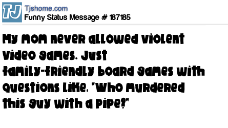 - # 158228 My parents never allowed violent video games. Just family-friendly board games with questions like, "Who murdered this guy with a pipe?"