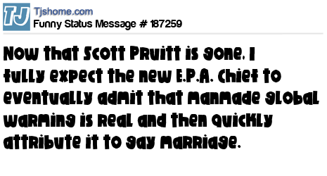 X says Now that Scott Pruitt is gone, I fully expect the new E.P.A. Chief to eventually admit that manmade global warming is real and then quickly attribute it to gay marriage.