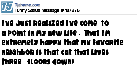 X says I’ve just realized I’ve come to a point in my new life . That I’m extremely happy that my favorite neighbor is that cat that lives three floors down!