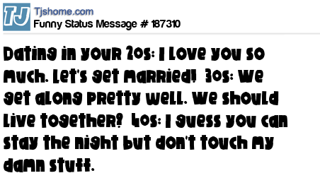 X says Dating in your 20s: I love you so much. Let's get married! 30s: We get along pretty well. We should live together? 40s: I guess you can stay the night but don't touch my damn stuff.