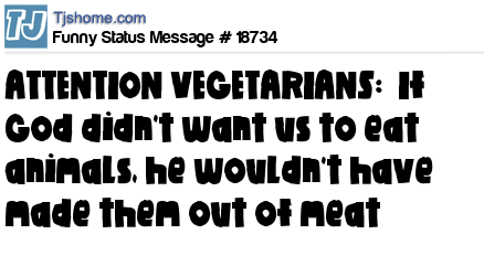 - # 7038 if God didn't want us to eat animals, he wouldn't have made them out of meat!!!