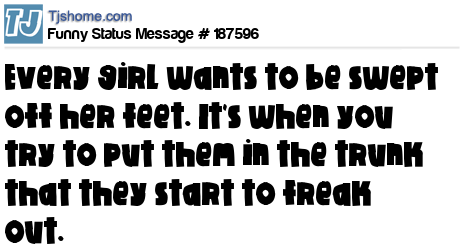 - # 185186 every girl like to be swept of her feet,.... its when you put her in the trunk that she freaks out.