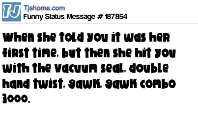 X says When she told you it was her first time, but then she hit you with the vacuum seal, double hand twist, gawk, gawk combo 3000.