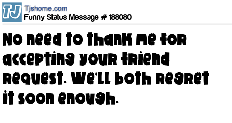 X says No need to thank me for accepting your friend request. We'll both regret it soon enough.
