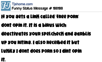 - # 192826 If you gets a link called 'free porn' don't open it. It is a birus wich deactivates your spelchek and garblis up you riting. I also receibed it but lukily I dont does porn so I dint opin it. Lil