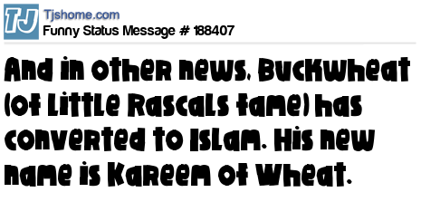X says And in other news, Buckwheat (of Little Rascals fame) has converted to Islam. His new name is Kareem of Wheat.