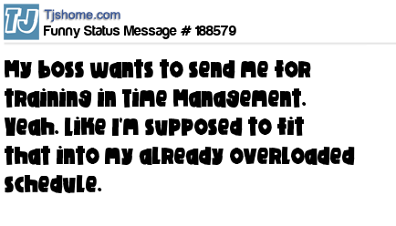 - # 180139 My boss wants me to go to Time Management training today. Yeah, like I'm really going to be able to squeeze that into my already overloaded schedule.