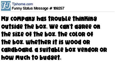 X says My company has trouble thinking outside the box. We can't agree on the size of the box, the color of the box, whether it is wood or cardboard, a suitable box vendor or how much to budget.