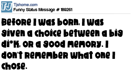 - # 38830 When I was born, I was given a choice - A big di*k or a good memory.. the thing is I can't remember which I chose.