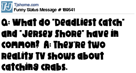 - # 86461 My friend asked me today what the name of the show is where they go fishing and catch all the crabs..I said "Jersey Shore"...Was I wrong?
