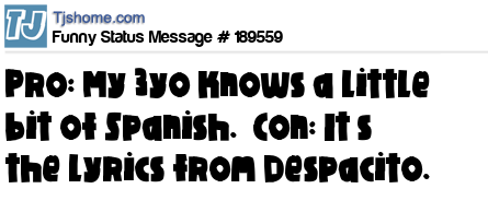 X says Pro: My 3yo knows a little bit of Spanish. Con: It’s the lyrics from Despacito.