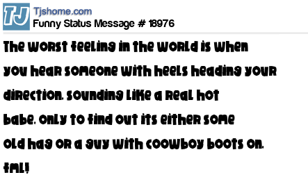 - # 185339 The worst feeling in the world is when you hear someone with heels heading your direction, sounding like a real hot babe, only to find out its either some old hag or a guy with coowboy boots on