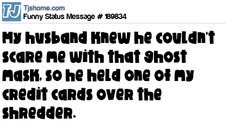 X says My husband knew he couldn't scare me with that ghost mask, so he held one of my credit cards over the shredder.