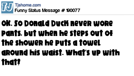 - # 181529 So Donald duck never wore pants, but when he gets out of the shower he puts a towel around his waist. What's up with that?