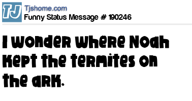 - # 113732 If God had a sense of humor, he would have asked Noah to bring a pair of termites on board.