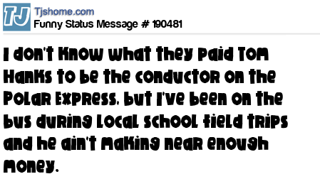 X says I don't know what they paid Tom Hanks to be the conductor on the Polar Express, but I've been on the bus during local school field trips and he ain't making near enough money.