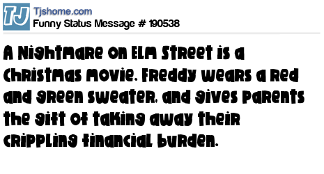 X says A Nightmare on Elm Street is a Christmas movie. Freddy wears a red and green sweater, and gives parents the gift of taking away their crippling financial burden.