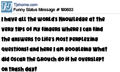 X is I have all the world's knowledge at the very tips of my fingers where I can find the answers to life's most perplexing questions! and here I am googleing What did Oscar the Grouch do if he overslept on trash day?