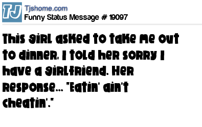 X This girl asked to take me out to dinner, I told her sorry I have a girlfriend. Her response... "Eatin' ain't cheatin'."