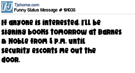 X is If anyone is interested, I'll be signing books tomorrow at Barnes & Noble from 5 p.m. until security escorts me out the door.