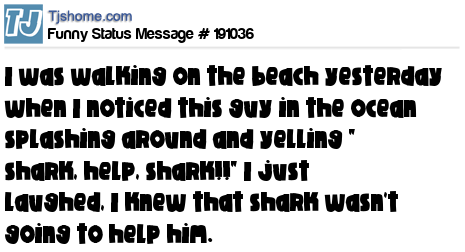 - # 127368 When I was at the beach there was a guy in the ocean yelling, "Shark! Help!" And I just laughed. I knew that shark wasn't going to help him.