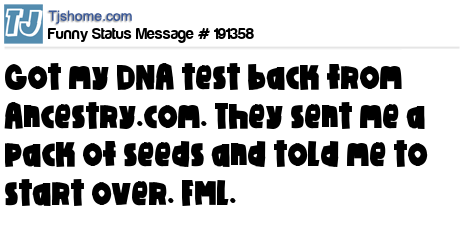 X says Got my DNA test back from Ancestry.com. They sent me a pack of seeds and told me to start over. FML.