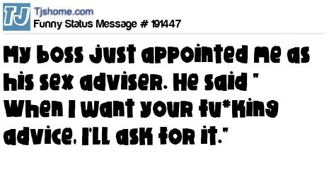 X is My boss just appointed me as his sex adviser. He said " When I want your fu*king advice, I'll ask for it."