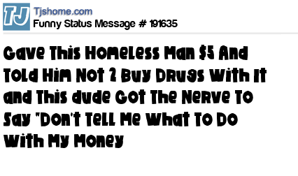 - # 63449 A homeless guy just asked me for money, and I almost gave it to him, but then I thought... he's just going to use it for drugs and alcohol, and then I thought... That's what I'm going to use it for