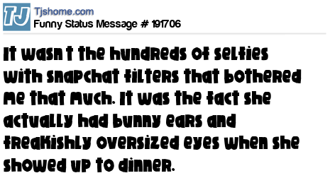 X is It wasn’t the hundreds of selfies with snapchat filters that bothered me that much. It was the fact she actually had bunny ears and freakishly oversized eyes when she showed up to dinner.