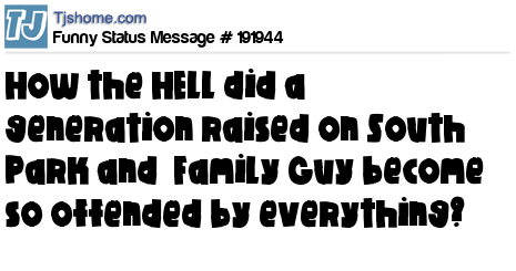 - # 203063 How the hell did a generation raised on South Park and Family Guy become so offended by everything?