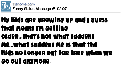 X says My kids are growing up and I guess that means I'm getting older...that's not what saddens me...what saddens me is that the kids no longer eat for free when we go out anymore.