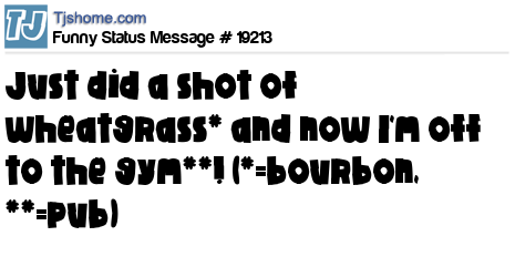 X just did a shot of wheatgrass* and now I'm off to the gym**! (*=bourbon, **=pub)