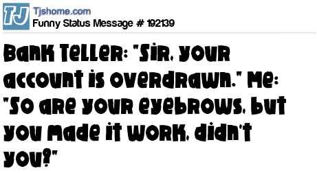 X says Bank Teller: "Sir, your account is overdrawn." Me: "So are your eyebrows, but you made it work, didn't you?"