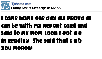 - # 191049 I came home one day all proud as can be with my report card, I said to my mom, look I got a B in Reading, she said to me that's a D you moron!