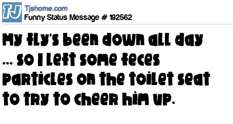 X says My fly's been down all day ... so I left some feces particles on the toilet seat to try to cheer him up.
