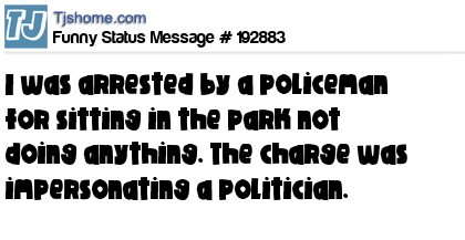 X is I was arrested by a policeman for sitting in the park not doing anything. The charge was impersonating a politician.
