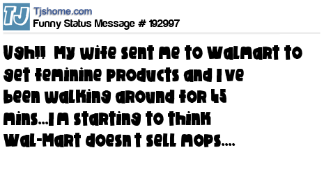 X says Ugh!! My wife sent me to Walmart to get feminine products and I’ve been walking around for 45 mins...I’m starting to think Wal-Mart doesn’t sell mops....