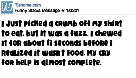 X says I just picked a crumb off my shirt to eat, but it was a fuzz. I chewed it for about 13 seconds before I realized it wasn’t food. My cry for help is almost complete.