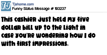 X says This cashier just held my five dollar bill up to the light in case you're wondering how I do with first impressions.