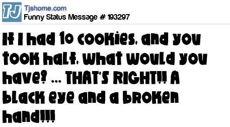 X says if I had 10 cookies, and you took half, what would you have? ... THAT'S RIGHT!! A black eye and a broken hand!!!