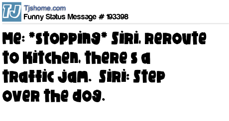 X says Me: *stopping* Siri, reroute to kitchen, there’s a traffic jam. Siri: Step over the dog.
