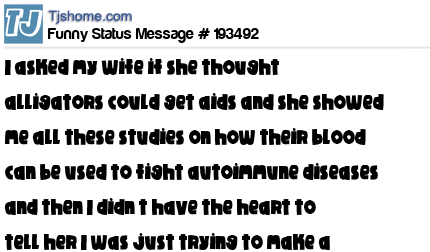 X says I asked my wife if she thought alligators could get aids and she showed me all these studies on how their blood can be used to fight autoimmune diseases and then I didn’t have the heart to tell her I was just trying to make a Gatorade joke.