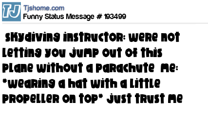 X says skydiving instructor: were not letting you jump out of this plane without a parachute me: *wearing a hat with a little propeller on top* just trust me