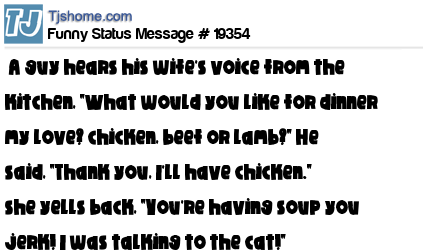 X A guy hears his wife's voice from the kitchen, "What would you like for dinner my love? chicken, beef or lamb?" He said, "Thank you, I'll have chicken." she yells back, "You're having soup you jerk! I was talking to the cat!"