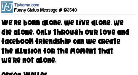 - # 194545 We're born alone, we live alone, we die alone. Only through our love and facebook can we create the illusion for the moment that we're not alone. Orson Welles