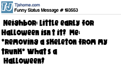 X says Neighbor: Little early for Halloween isn’t it? Me: *removing a skeleton from my trunk* What’s a “Halloween?”